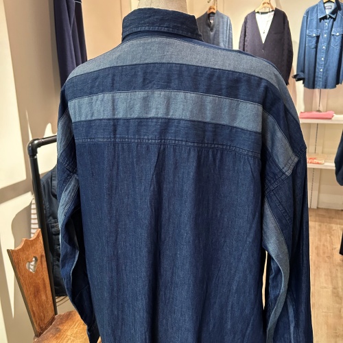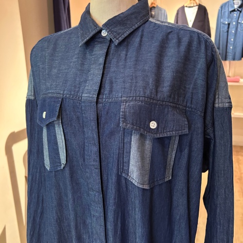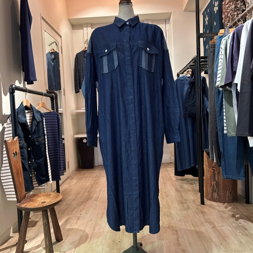 シャツ地のデニムの表裏でパッチワーク生地をを作りシャツに仕立てました。近年、国内ではパッチワーク生地の生産が減少している中で、インドでは昔から伝統的にパッチワーク生地の生産が盛んです。そのインド生産の特徴を生かして良い意味できれいすぎない味のある手の込んだ生地を作りました。比翼仕立てのワンピースに仕立てており、前を開けてコート感覚でも着用が可能。部分使いしたパッチワーク生地をきかせたコーディネートしやすいデザインにしております。