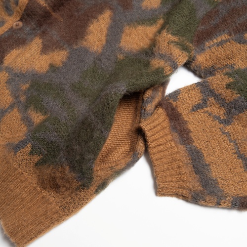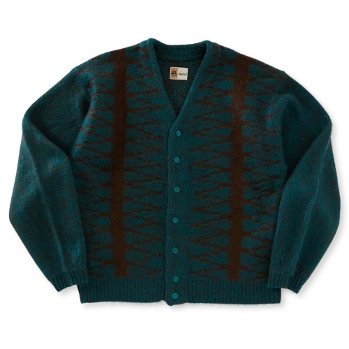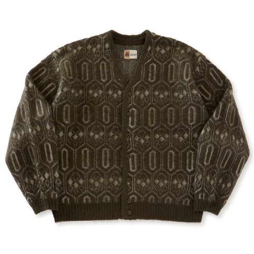 TOWNCRAFT別注のシャギーカーディガンの新作。編立で柄を織りたて、無地とは異なる魅力のある雰囲気に仕上げました。カラー:キャメルはトライバルカモをモチーフにして、色目を調整した独特なパターン。カラー:オリーブは絣柄のようなモチーフを参考にして、オリーブにグレーでの柄の織り立てで、渋みのある色合いに。カラー:グリーンのフロントはツリー柄ですが、スカルっぽい雰囲気もあり、明るめのグリーンに赤茶を差し込むことで、溶け込みやすい色目に仕上げました。サイドにはポケットがついています。