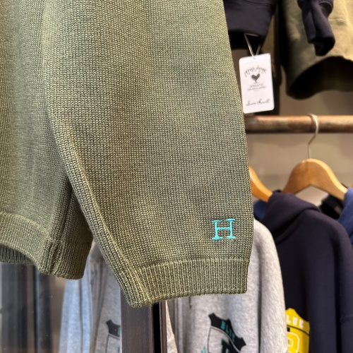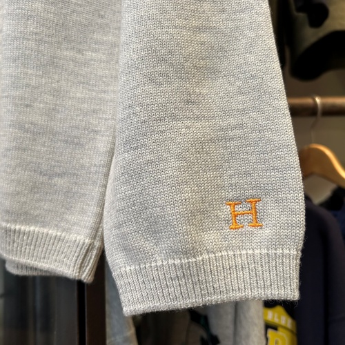 やわらかい色味が特徴のベーシックなニットシリーズ。表地は厳選された豪州メリノ(エクストラファインウール)を使用。オフスケール加工によりソフトな風合いと豊かな発色性、ふくらみ感を合わせ持つニット糸です。裏地にはウェーブ形状のコットンを使用。保温性を維持しながら肌当たりも考慮した、秋冬に適した素材です。袖口にはおなじみの「H」刺しゅうがさりげなく入ります。前年モデルと比べると、身幅に程よくゆとりを持たせたサイズ感にアップデート。ベーシックで着回しのきくアイテムです。洗濯も可能で取り扱いしやすいのもポイントです。