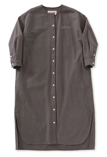 インドで織り上げた柔らかなシャムース生地で仕立てたワンピースです。やわらかく、優しい風合いで織り上げたオリジナルシャムース生地を使用しています。微起毛で触り心地の良さが際立ちます。印象的なステッチワークを施しています。控えめなデザインのオリジナルボタンや、手刺しゅうであしらった「HRM」ロゴがさりげないアクセントになっています。