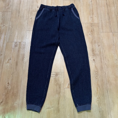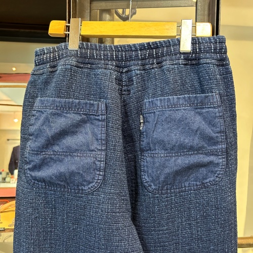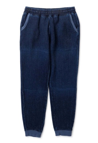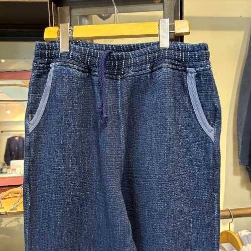 BLUE BLUEの新定番オリジナルデニム「フロージャカードデニム」を使ったアイテム。生地の表面に経糸のインディゴ糸が流れるように複雑な線となって表れた表情豊かなオリジナルデニム。もっちりと肉厚な素材で、ニットのような柔らかさも併せ持っています。生地の表面に多く経糸が出ているで、生地のひっかけに注意してください。スウェットパンツをモチーフにオリジナルのフロージャカードデニムで作りました。洗い加工で馴染んだ3素材のブルーのコントラストが雰囲気抜群。