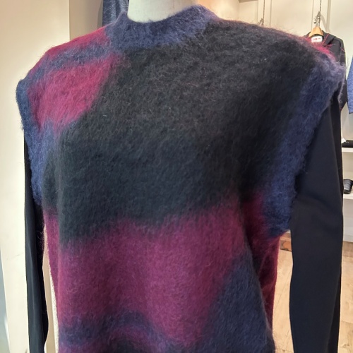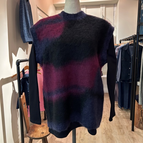 グラデーションカラーや素材を活かしたシンプルなクルーネックベストです。 毛足の表情があり、ソフトな肌触りのキッドモヘアとウール糸をミックスしましたミドルゲージのニットです。毛足を掻いて軽くて柔らかなシャギータッチに仕上げています。 ニットジャカード編みでグラデーションのカラーパターンを表現しました。シャギー感と軽さが相まってふわふわと暖かいです。プレーンなクル―のベストスタイルはコーディネイトしやすく華のある一枚でお勧めです。
