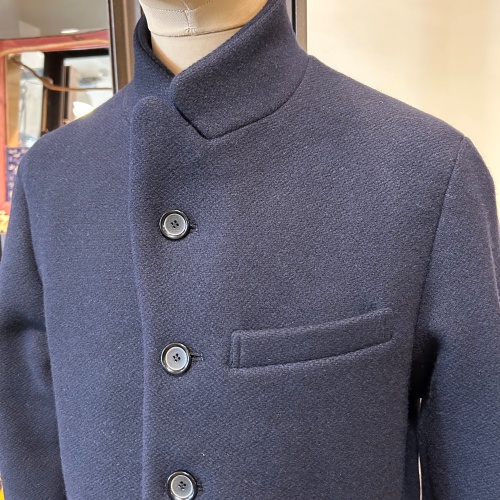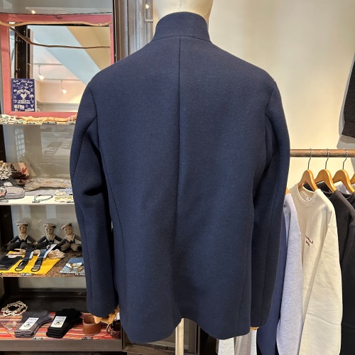 BLUE BLUE JAPANの冬の定番、「5Bジャケット」をアップデートしました。従来のメルトン素材とは異なり、ドビー組織でしっかりと目が立った素材感が特徴です。タテ糸よりもヨコ糸の密度を高くし、二重織にしています。やや細番手の糸を3本取りで撚ることで、ふくらみと肉厚感のある仕上がりになっています。ラペルの形をなだらかに修正し、よりベーシックな雰囲気に仕上げました。袖山がきれいに馴染むように改善。クラシックな雰囲気を持つスタンドラペルのジャケットをモダンなサイズ感に調整し、身頃や肩回りに適度なゆとりをもたせています。