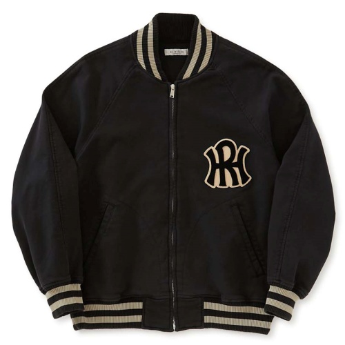 生地の特徴であるストレッチ性を考慮した、クラシックなバーシティジャケットのデザインを採用しました。スウェットの様な風合い、秋口から春先に適したストレッチ機能を持つ素材。裏面はパイル起毛が施されており肌触りがよく、ウォーム感がありながら蒸れにくいところが特徴です。スウェット素材のようなストレッチ性、稼働域が十分な素材特徴から、ジャストサイズで羽織れるサイズ感に仕上げています。フロントはファスナー開きを採用し、胸のロゴはオリジナルサガラワッペンを入れています。製品染めの雰囲気を活かしつつ洗いざらしの風合いにしています。