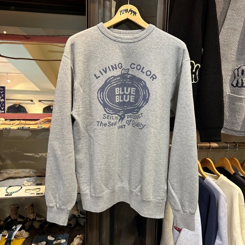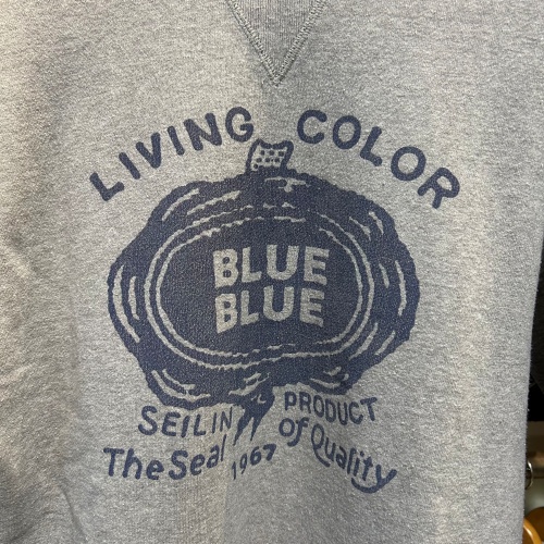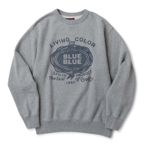 手紙に封をするときのSEAL WAXがモチーフ。1970年代初頭の現存数が少ない希少なアズマ編機を使用した裏毛のスウェット生地。現代の編み機に比べゆっくりと時間をかけて編みこんだ生地は特有のふくらみと柔らかさがあります。2025年秋冬からリニューアルしたBLUE BLUEのプリントベース。袖付けもセットインスリーブになり、少し肩の落ちる雰囲気に。2色を重ねてプリントした後に洗いをかけて上のプリントを割れさせることで下の色が少し覗くようになり、着古したような奥行き感のあるプリント。