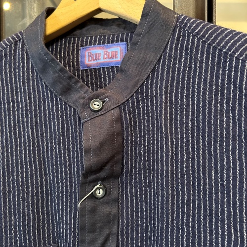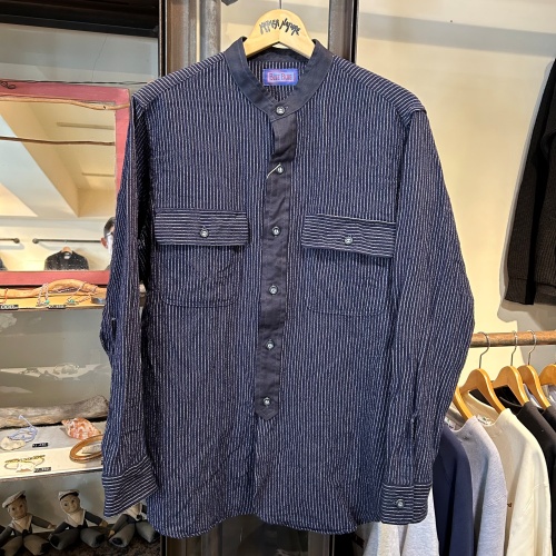 コットンウールガーゼストライプバンドカラーシャツ