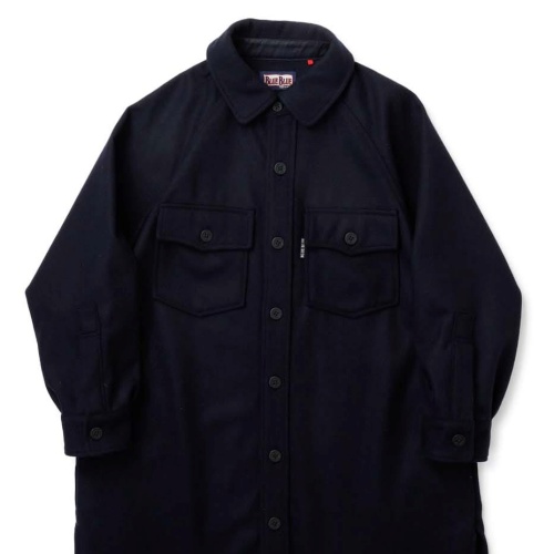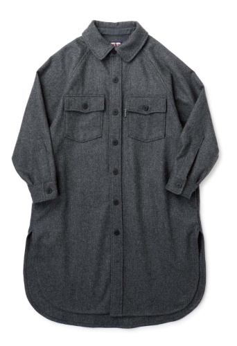 軽くて柔らかなライトメルトン生地で作った、CPOシャツをモチーフにしたシャツワンピースです。程良く厚みがありながら、軽くて柔らかなライトメルトン生地です。ゆったりとした大き目のシルエットが特徴です。シャツワンピースとしてはもちろん、軽いアウターとしても使いやすいアイテムです。アンカー釦等でミリタリーらしい雰囲気も残したワンピースに仕上がりました。