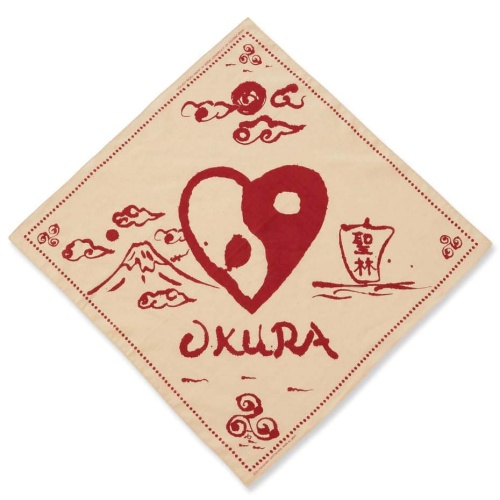 フラッグシップストア・OKURAの象徴的なハートインヤンを大胆にあしらい、「OKURA」の文字を大きく配したアイコニックなバンダナです。