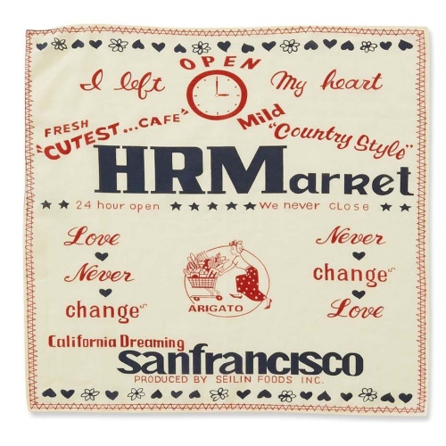 HOLLYWOOD RANCH MARKETを象徴する、「マーケット」をモチーフにしたバンダナです。ブランドのメッセージ、ポップなタッチで描かれたロゴ、キャラクターデザインなど、HOLLYWOOD RANCH MARKETの世界観が詰まった一点となっています。