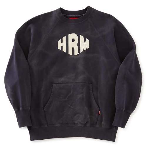 ダイヤ状にアレンジしたHRMロゴをシンプルに施したオリジナルスウェットプルオーバー。古着のような味わいある加工感が特徴です。フロントにあしらったカンガルーポケットもデザインとしてポイントになっています。適度な柔らかな風合いもありつつ、しっかりと目の詰まったスウェット生地。タフさしなやかさのバランスの良い生地感です。身幅・アームはゆとりがありながら、ウエストリブでしっかりと収まる緩やかなシルエットです。