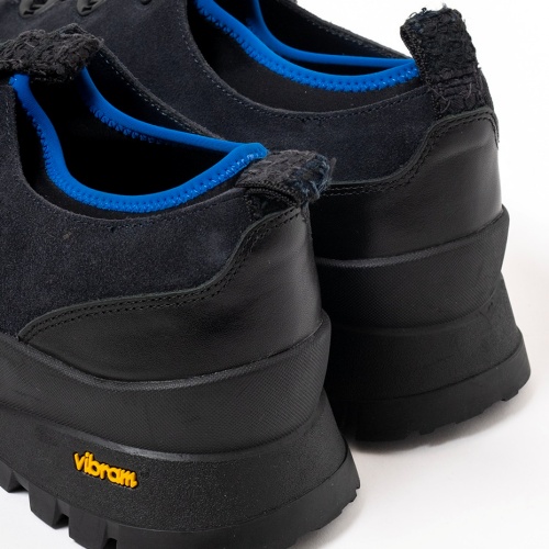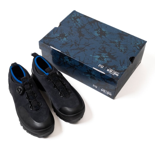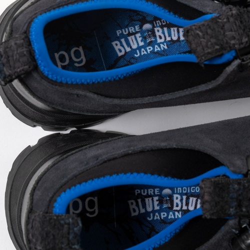 「PG」とBLUE BLUE JAPANの初となるコラボレーション商品です。アッパーはグレージュカラーのカウ・スエードを使用し、2026年春夏テーマ「玻璃」を表現しています。ソールには、グリップ力と耐久性に優れたVibramソールを採用し、タフさと実用性を持たせています。甲部分にあるダイヤルを回し調節できるFREELOCKシステムで、脱ぎ履きする際の一連の流れをスムーズに行っていただるモデルです。タン部分のタブには生地を裂き再利用して作成したBLUE BLUE JAPAN オリジナルのサキオリ生地を使用しています。コレクションテーマのガラスパターンを施したインソールと履き口のブル―のパイピングが印象的なスニーカーです。