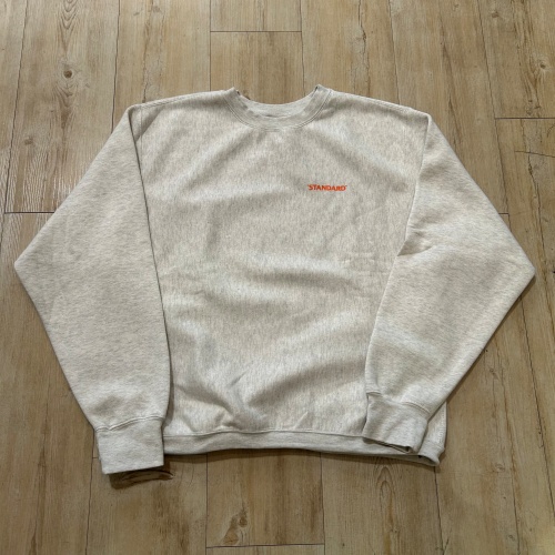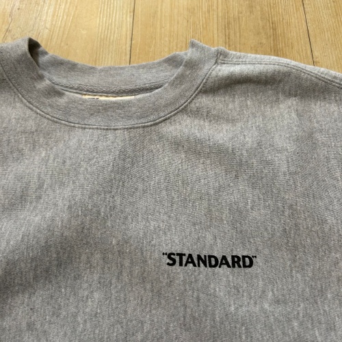 HIGH! STANDARDの店舗ファサードでおなじみの「STANDARD」オリジナルロゴをワンポイントで左胸にあしらったクルースウェット 。ボディはUSメーカー”MV SPORT"の11ozのPRO WEAVEを使用。柔らかい11ozの素材で、サイドリブがあるリバース仕様です。裾のリブを短くカットし、ストリングを内蔵させてことにより、シルエットの変化が楽しめます。