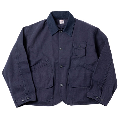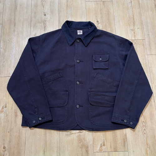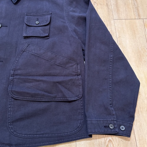 オリジナルでハンティングジャケットを作製。弾入れやゲームポケット等、日常使いには使用しないディティールは排除して、シンプルに仕上げています。ブルゾンのように気軽に着用できるように着丈を短めに設定しています。素材はコットンのツイル素材で、襟だけ素材を変更している仕様もポイントです。