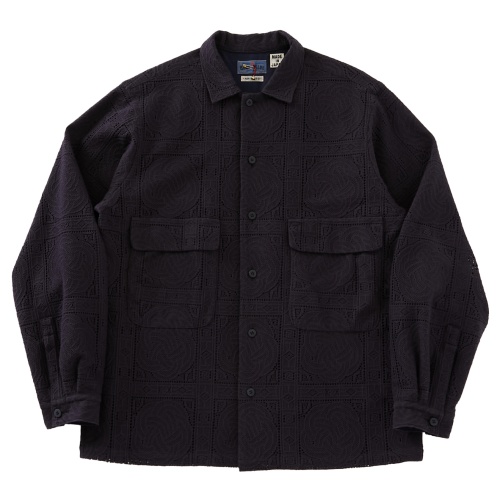フロントに2ポケットディテールのオープンカラーシャツです。MADE IN JAPANのレースは年々と減っており、産地である福井県の貴重なレース織機で編んだレースジャカード生地です。水引をモチーフにアレンジしたオリジナルパターンで、立体感が出る様に複雑に構成された柄表現をしています。第一釦を締めても、開けて開襟で着るのも、どちらもお勧めです。胸の2ポケットがポイントで、プレーンなスタイルながら、裏側に生地を重ねる事で、レースのシアーな表情を感じられる様作っています。シャツとしてもちろん、羽織の様にも着られる、着こなしの幅が広いシャツです。