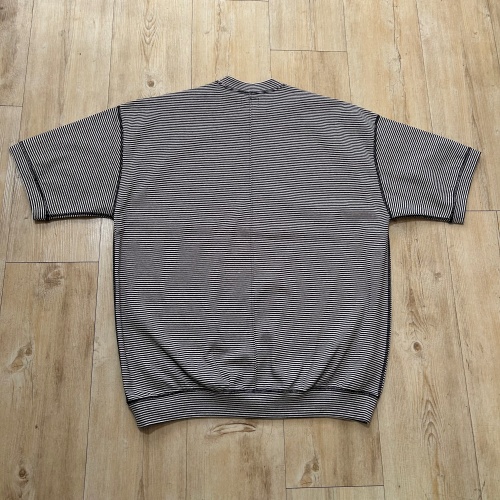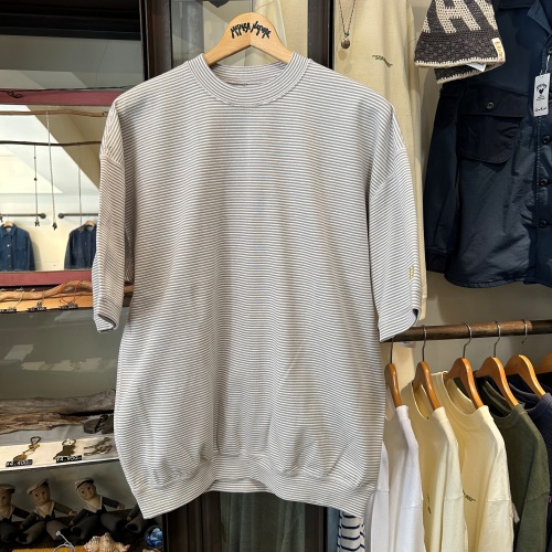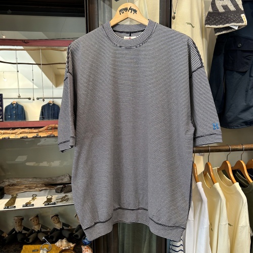 ストレッチフライスの新しい生地を使った、ワイドシルエットの裾リブ仕様のTシャツ。繊細なミジンボーダーで新たに作成致しました。既存のストレッチフライスとは一線を画した地厚なストレッチフライス生地を新たに作成しました。従来のフライスと同じ素材で糸の太さを30番手から20番手にしてセミシルケット加工を施すことで厚みを持ちながらさらりとした肌触りと適度な光沢で、カジュアルながらも上品な素材感が特徴です。後身頃の中心で切り返しを施すことでゆとりのあるラインを生み、裾リブにより全体的に丸みのあるシルエットを作り出してくれます。