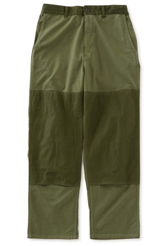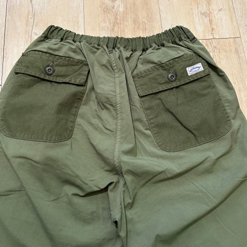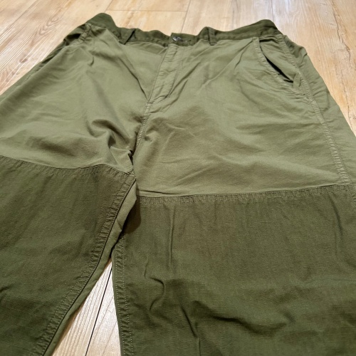 おなじみのフィールソーグッドシリーズからファティーグパンツをベースにモディファイした商品です。表地にフィールソーグッドの素材、別布にコットンリップストップとコットンヘリンボーンの3素材を使用。更に製品染めにする事による生地ごとの染めのコントラストが出る雰囲気が味わい深い商品です。裏面がパイル地になった、吸湿性と通気性に優れたフィールソーグッド素材。とても柔らかい肌触りで着心地が良く、ストレッチ性を持ち合わせています。ベースのモデルからデザインをモディファイしており、ミリタリーベースにダブルニー仕様のワーク要素をミックスしております。リラックスフィットなシルエットになります。